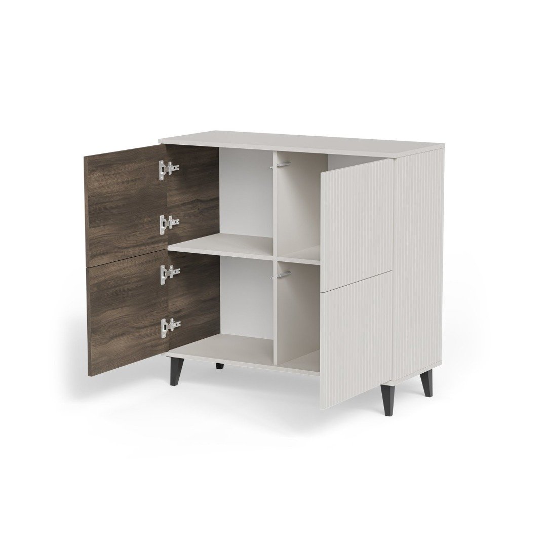 Kašmírová barva v kombinaci s přírodní ořechovou texturou a elegantní černými detaily vytváří harmonii, která se hodí jak do minimalistických, tak do luxusně zařízených interiérů. Komoda RANDOM 2 je dokonalým doplňkem do obývacího pokoje, ložnice nebo předsíně – zapadne všude, kam ji umístíte, a zároveň přitáhne pozornost svou jedinečností.