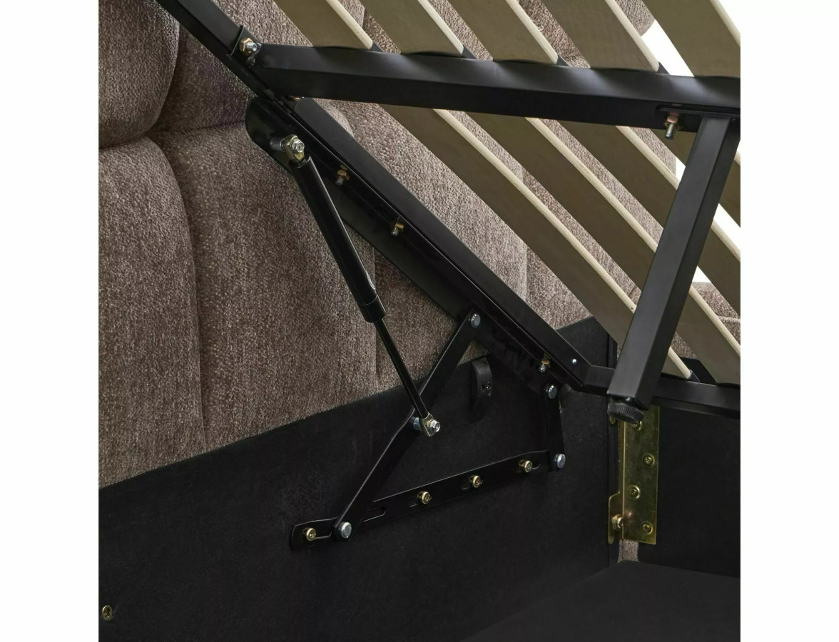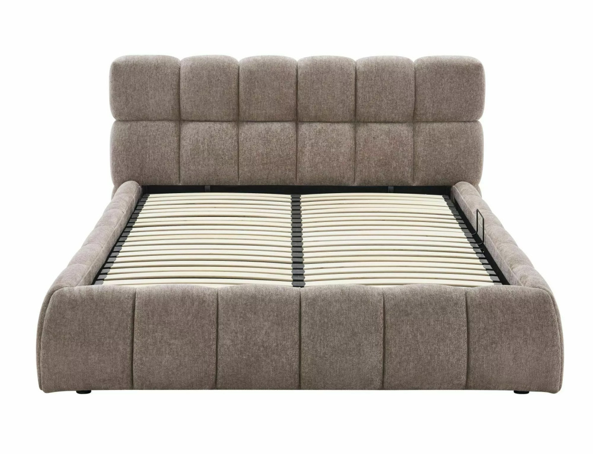 Pod ložnou plochou se skrývá prostorný úložný box. Peřiny, polštáře, povlečení, deky na zimu – všechno zmizí z dohledu a ložnice zůstane uklizená. Otevírání zajišťují plynové vzpěry, takže zvednete rošt jedním plynulým pohybem, bez námahy.