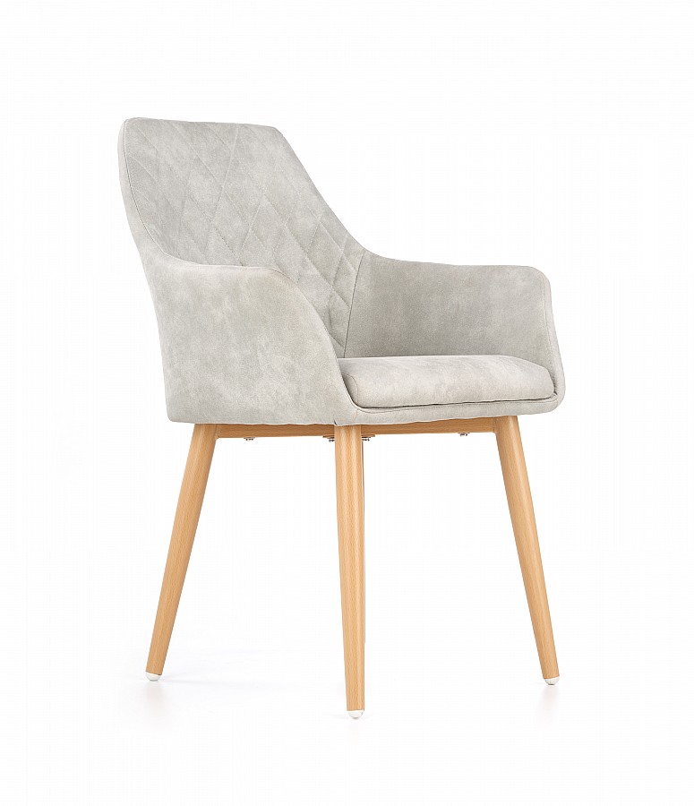 Křesílko K287 je atraktivní židle čalouněná šedou ekokůží, s pohodlnými područkami, o které si můžeme volně opřít ruce a uvolnit své tělo. Čalounění z ekokůže se snadno udržuje v čistotě, lze jej rychle vyčistit a působí velmi elegantně. Nohy židle jsou vyrobeny z lakované oceli, imitující barvu dřeva. Ozdobné prošívání na opěradle dodává židli atraktivní vzhled a pohodlný sedák zajišťuje pohodlí při používání. Plastové konce nohou zabraňují poškrábání podlahy. Židle K287 je ideální variantou pro lidi, kteří oceňují jedinečné produkty, svým designem odkazuje k modernímu retro stylu. Skvěle se bude hodit na stůl v jídelně nebo obývacím pokoji a poskytne maximální pohodlí při stolování s rodinou. Židli vám dodáme v demontu.